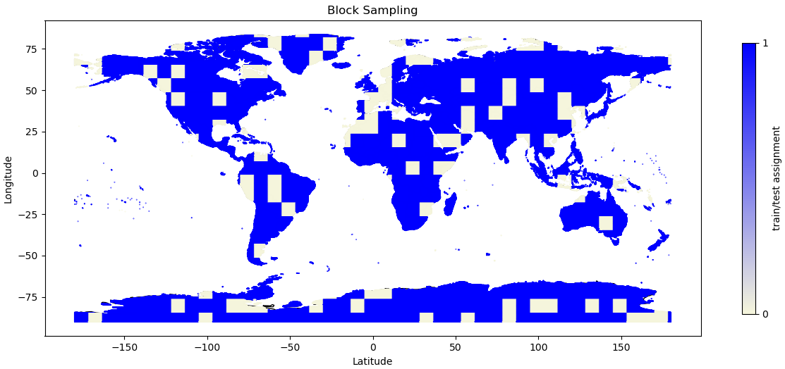 It is therefore mandatory to utilize techniques that respects the basic principles of geo-data way beyond naive random split method in the Earth system context. To avoid auto-correlation during the training phase of the model, data splitting should rather be guided by the block split strategy, which segments data into contiguous blocks based on geographical and temporal proximity, assigning data points from these blocks to either training or test sets with a specific probability. This strategy keeps closely related data points together, reducing information leakage across the train-test divide and enhancing testing integrity.